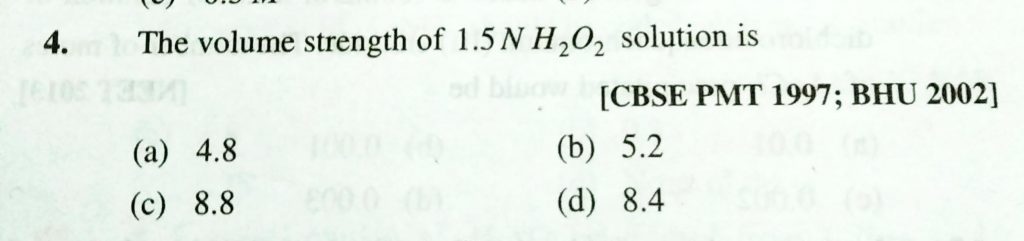 The volume strength of 1.5 N H2O2 solution is (a) 4.8 (b) 5.2 (c) 8.8 (d) 8.4 The volume strength of 1.5 N H2O2 solution is (a) 4.8 (b) 5.2 (c) 8.8 (d) 8.4 December 15, 2020 Category: Uncategorised (JEE Advanced Physics by BM Sharma + GMP Solutions) , Facebook Messenger WhatsApp Share this:TwitterFacebook Related