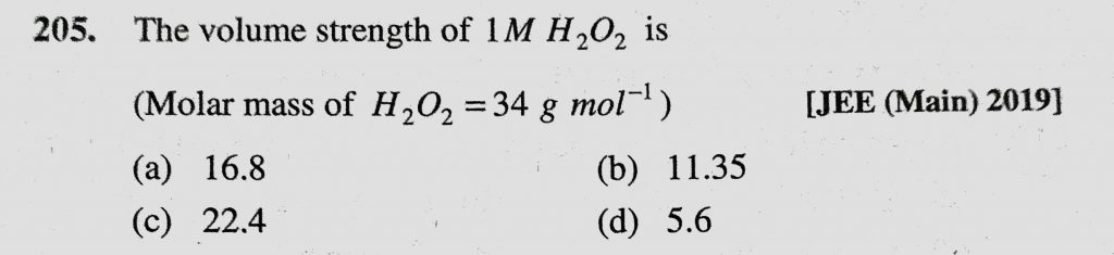 The volume strength of 1M H2O2 is (Molar mass of H2O2 = 34 g/mol) (a) 16.8 (b) 11.35 (c) 22.4 The volume strength of 1M H2O2 is (Molar mass of H2O2 = 34 g/mol) (a) 16.8 (b) 11.35 (c) 22.4 November 28, 2020 Category: Uncategorised (JEE Advanced Physics by BM Sharma + GMP Solutions) , Facebook Messenger WhatsApp Share this:TwitterFacebook Related
