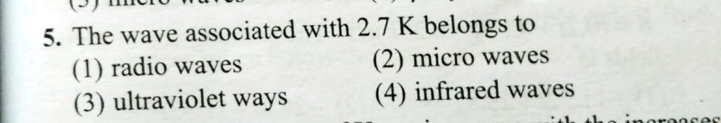 The wave associated with 2.7 K belongs to (a) radio waves ( b ) micro waves The wave associated with 2.7 K belongs to (a) radio waves ( b ) micro waves October 28, 2020 Category: Uncategorised (JEE Advanced Physics by BM Sharma + GMP Solutions) , Facebook Messenger WhatsApp Share this:TwitterFacebook Related