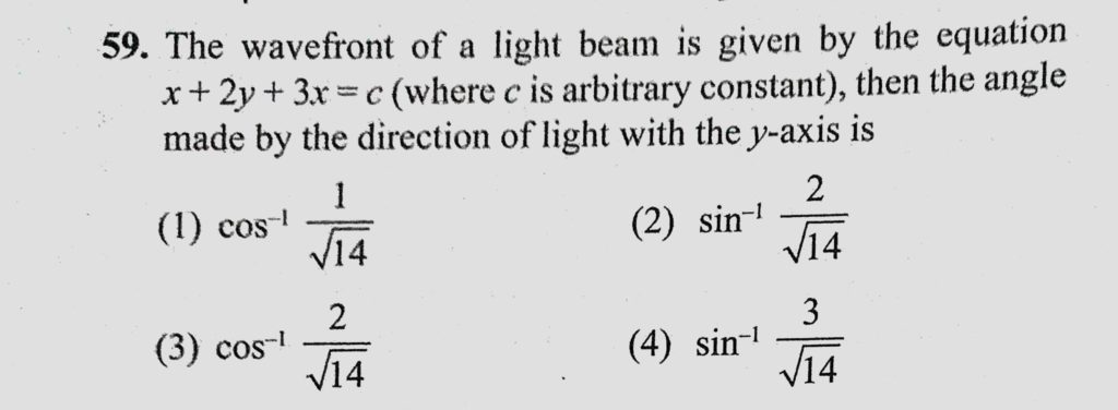 The wavefront of a light beam is given by the equation x + 2y + 3x = c (where c is arbitrary constant), then the angle made by the direction of light with the y-axis is The wavefront of a light beam is given by the equation x + 2y + 3x = c (where c is arbitrary constant) then the angle made by the direction of light with the y-axis is October 10, 2020 Category: Uncategorised (JEE Advanced Physics by BM Sharma + GMP Solutions) , Facebook Messenger WhatsApp Share this:TwitterFacebook Related