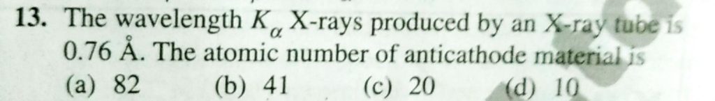 The wavelength K alpha X -rays produced by an X- ray tube is 76 A. The atomic number of anticathode material is The wavelength K alpha X -rays produced by an X- ray tube is 76 A. The atomic number of anticathode material is September 14, 2020 Category: Uncategorised (JEE Advanced Physics by BM Sharma + GMP Solutions) , Facebook Messenger WhatsApp Share this:TwitterFacebook Related