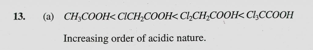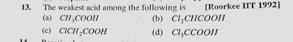 The weakest acid among the following is (a) CH3COOH (b) Cl2CHCOOH (c) ClCH2COOH (d) Cl3CCOOH The weakest acid among the following is (a) CH3COOH (b) Cl2CHCOOH (c) ClCH2COOH (d) Cl3CCOOH February 13, 2021 Category: Uncategorised (JEE Advanced Physics by BM Sharma + GMP Solutions) , Facebook Messenger WhatsApp Share this:TwitterFacebook Related