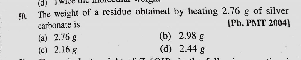The weight of a residue obtained by heating 2.76 g of silver carbonate is The weight of a residue obtained by heating 2.76 g of silver carbonate is December 7, 2020 Category: Uncategorised (JEE Advanced Physics by BM Sharma + GMP Solutions) , Facebook Messenger WhatsApp Share this:TwitterFacebook Related