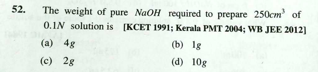 The weight of pure NaOH required to prepare 250 Cm^3 of 0.1 N solution is The weight of pure NaOH required to prepare 250 Cm^3 of 0.1 N solution is December 11, 2020 Category: Uncategorised (JEE Advanced Physics by BM Sharma + GMP Solutions) , Facebook Messenger WhatsApp Share this:TwitterFacebook Related