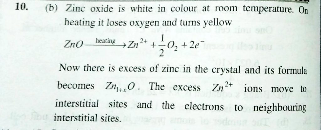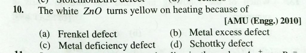 The white ZnO turns yellow on heating because of (a) Frenkel defect (b) metal excess defect (c) Metal deficiency defect (d) Schottky defect The white ZnO turns yellow on heating because of (a) Frenkel defect (b) Metal excess defect (c) Metal deficiency defect (d) Schottky defect February 9, 2021 Category: Uncategorised (JEE Advanced Physics by BM Sharma + GMP Solutions) , Facebook Messenger WhatsApp Share this:TwitterFacebook Related