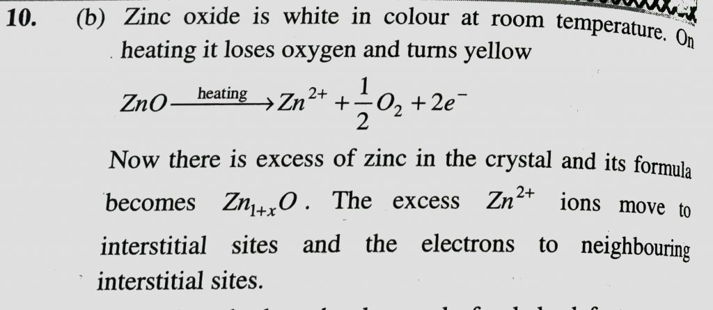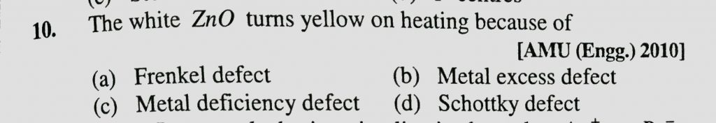 The white ZnO turns yellow on heating because of (a) Frenkel defect (b) Metal excess defect (c) Metal deficiency defect (d) Schottky defect The white ZnO turns yellow on heating because of (a) Frenkel defect (b) Metal excess defect (c) Metal deficiency defect (d) Schottky defect December 17, 2020 Category: Uncategorised (JEE Advanced Physics by BM Sharma + GMP Solutions) , Facebook Messenger WhatsApp Share this:TwitterFacebook Related