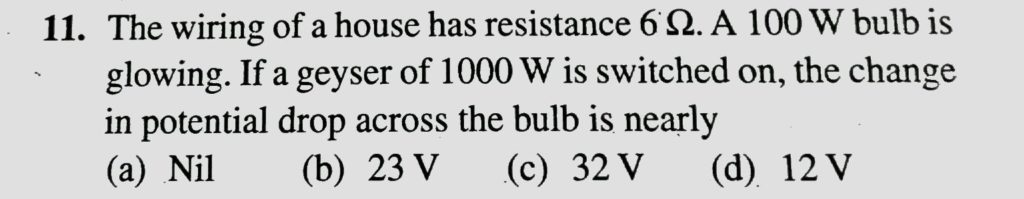 The wiring of a house has a resistance 6 ohm. A 100 W bulb is glowing. If a geyser of 1000 W is switched on, the change in potential drop across the bulb is nearly the change in potential drop across the bulb is nearly The wiring of a house has a resistance 6 ohm. A 100 W bulb is glowing. If a geyser of 1000 W is switched on September 21, 2020 Category: Uncategorised (JEE Advanced Physics by BM Sharma + GMP Solutions) , Facebook Messenger WhatsApp Share this:TwitterFacebook Related