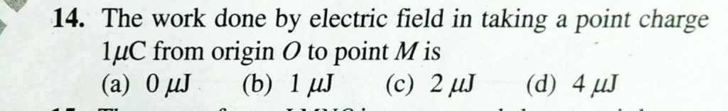 The work done by electric field in taking a point charge 1 muC from origin O to point M is The work done by electric field in taking a point charge 1 muC from origin O to point M is September 17, 2020 Category: Uncategorised (JEE Advanced Physics by BM Sharma + GMP Solutions) , Facebook Messenger WhatsApp Share this:TwitterFacebook Related