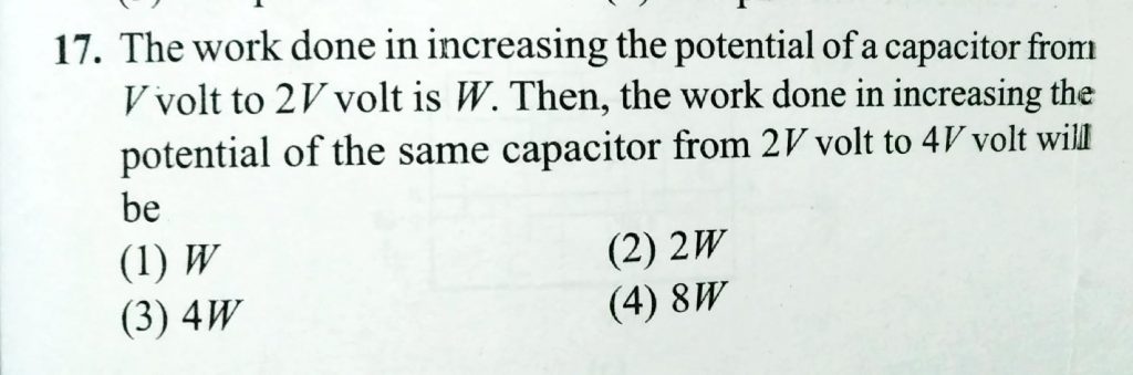 The work done in increasing the potential of a capacitor from V volt to 2V volt is W. Then, the work done in increasing the potential of the same capacitor from 2V volt to 4V volt will be? The work done in increasing the potential of a capacitor from V volt to 2V volt is W. Then the work done in increasing the potential of the same capacitor from 2V volt to 4V volt will be? November 7, 2020 Category: Uncategorised (JEE Advanced Physics by BM Sharma + GMP Solutions) , Facebook Messenger WhatsApp Share this:TwitterFacebook Related