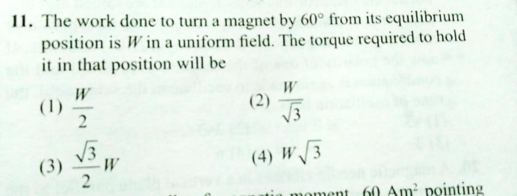 The work done to turn a magnet by 60 degree from its equilibrium position is W in a uniform field. THe torque required to hold it in that position will be The work done to turn a magnet by 60 degree from its equilibrium position is W in a uniform field. THe torque required to hold it in that position will be October 18, 2020 Category: Uncategorised (JEE Advanced Physics by BM Sharma + GMP Solutions) , Facebook Messenger WhatsApp Share this:TwitterFacebook Related