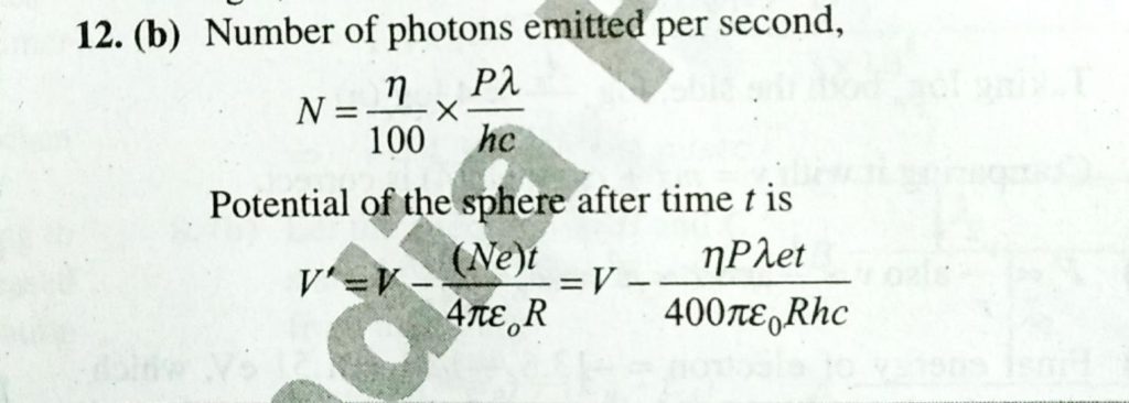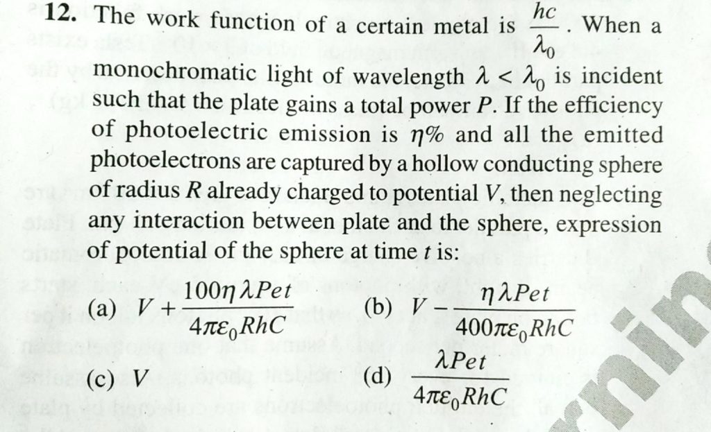 The work function of a certain metal is hC / λ0 . When a monochromatic light of wavelength λ<λ0 is incident such that the plate gains a total power P . If the efficiency of photoelectric emission is η% and all the emitted photoelectrons are captured by a hollow conducting sphere of radius R already charged to potential V , then neglecting any interaction of potential of the sphere at time t is: