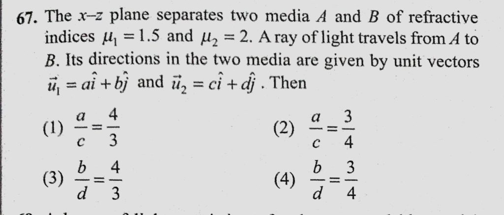 The x-z plane separates two media A and B of refractive indices mu 1 = 1.5 and mu 2 = 2. A ray of light travels from A to B. Its directions in the two media are given by unit vectors The x-z plane separates two media A and B of refractive indices mu 1 = 1.5 and mu 2 = 2. A ray of light travels from A to B. Its directions in the two media are given by unit vectors October 6, 2020 Category: Uncategorised (JEE Advanced Physics by BM Sharma + GMP Solutions) , Facebook Messenger WhatsApp Share this:TwitterFacebook Related