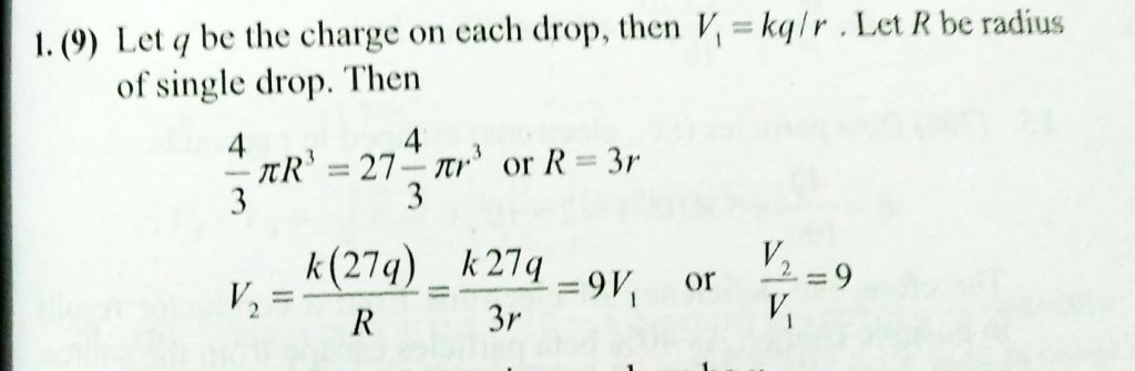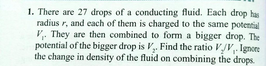 There are 27 drops of a conducting fluid. Each drop has radius r, and each of them is charged to the same potential V 1 .They are then combined to form a bigger drop.The potential of the bigger drop is V 2 .Find the ratio V 2 /V 1 . Ignore the change in density of the fluid on combining the drops.
