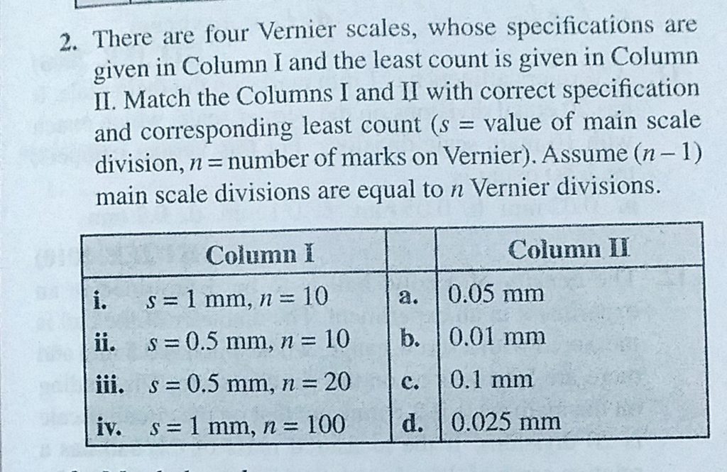 There are four Vernier scales, whose specifications are given in Column 1 and the least count is given in Column 2. Match the Columns 1 and 2 with correct specification and corresponding least count There are four Vernier scales whose specifications are given in Column 1 and the least count is given in Column 2. Match the Columns 1 and 2 with correct specification and corresponding least count September 15, 2020 Category: Uncategorised (JEE Advanced Physics by BM Sharma + GMP Solutions) , Facebook Messenger WhatsApp Share this:TwitterFacebook Related