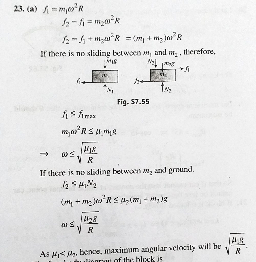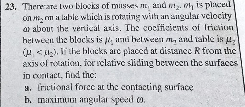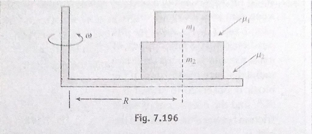 There are two blocks of masses m1 and m2. m1 is placed on m2 on a table which is rotating with an angular velocity omega about the vertical axis. The coefficients of friction between the blocks There are two blocks of masses m1 and m2. m1 is placed on m2 on a table which is rotating with an angular velocity omega about the vertical axis. The coefficients of friction between the blocks September 30, 2020 Category: Uncategorised (JEE Advanced Physics by BM Sharma + GMP Solutions) , Facebook Messenger WhatsApp Share this:TwitterFacebook Related