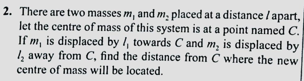 There are two masses m1 and m2, placed at a distance l apart, let the centre of mass of this system is at a point named C. If m1 is displaced by l1 towards C and m2 is displaced by l2 away from C, find the distance from (C) where the new centre of mass will be located.