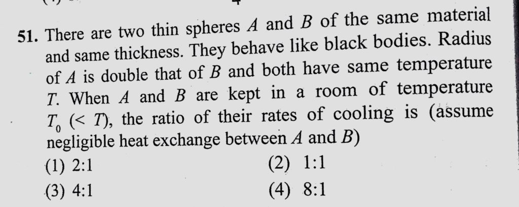 There are two thin spheres A and B of the same material and same thickness. They behave like black bodies. Radius of A is double that of B and both have same temperature T. There are two thin spheres A and B of the same material and same thickness. They behave like black bodies. Radius of A is double that of B and both have same temperature T. October 25, 2020 Category: Uncategorised (JEE Advanced Physics by BM Sharma + GMP Solutions) , Facebook Messenger WhatsApp Share this:TwitterFacebook Related