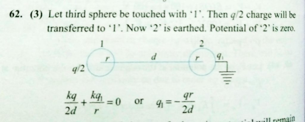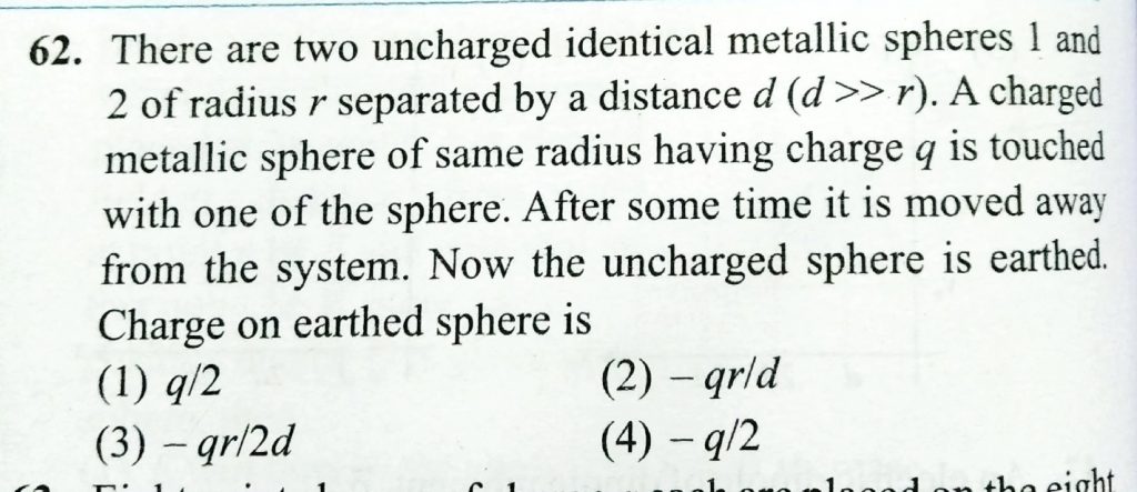 There are two uncharged identical metallic spheres of radius a, separated a distance d. A charged metallic sphere (charge q) of sarue radius is brought and touches sphere 1. After some time it is moved away to a far off distance. After this, the sphere 2 is earthed. Find the charge on sphere 2.