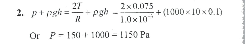 There is an air bubble of radius 1.0 mm in a liquid of surface tension 0.075 N/m and density 1000 kg/m^3 . The bubble is at a depth of 10.0 cm below the free surface of a liquid. By what amount is the pressure inside the bubble greater than the atmospheric pressure?