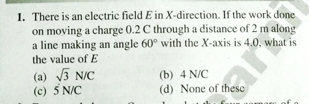 There is an electric field E in X = direction. If work done in moving a charge 0.2 C through a distance of 2m along a line making an angle of 60 degree with X−axis is 4.0 joule, what is the value of E? There is an electric field E in X = direction. If work done in moving a charge 0.2 C through a distance of 2m along a line making an angle of 60 degree with X−axis is 4.0 joule what is the value of E? September 17, 2020 Category: Uncategorised (JEE Advanced Physics by BM Sharma + GMP Solutions) , Facebook Messenger WhatsApp Share this:TwitterFacebook Related