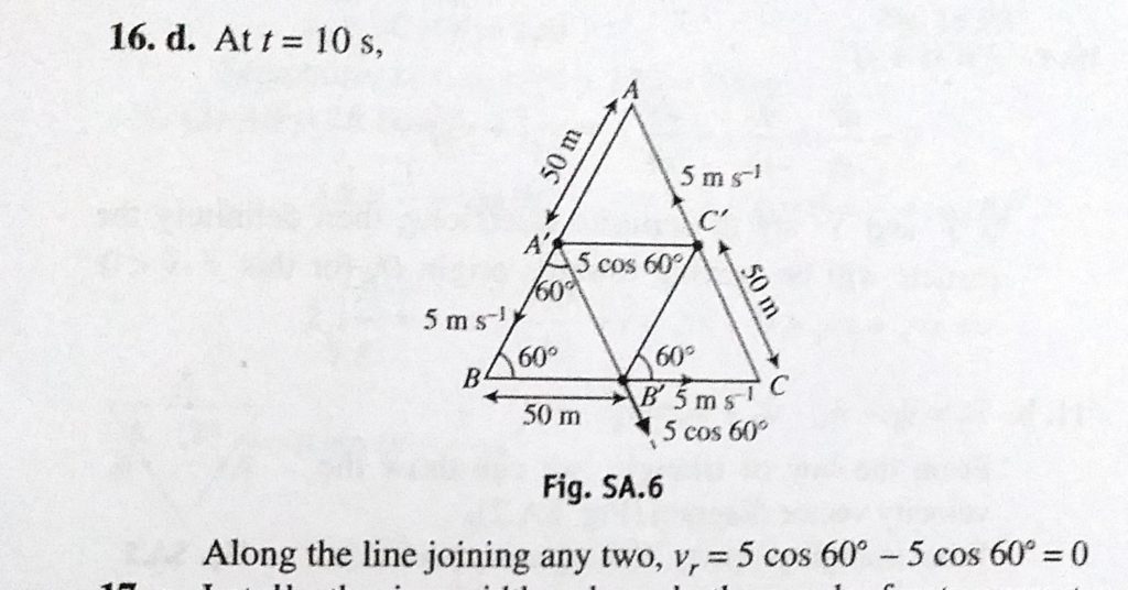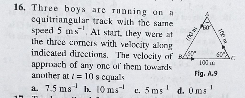 Three boys are running on a equitriangular track with the same speed 5 m/s. At start, they were at the three corners with velocity along indicated directions. The velocity of approach of any one of them towards they were at the three corners with velocity along indicated directions. The velocity of approach of any one of them towards Three boys are running on a equitriangular track with the same speed 5 m/s. At start September 24, 2020 Category: Uncategorised (JEE Advanced Physics by BM Sharma + GMP Solutions) , Facebook Messenger WhatsApp Share this:TwitterFacebook Related