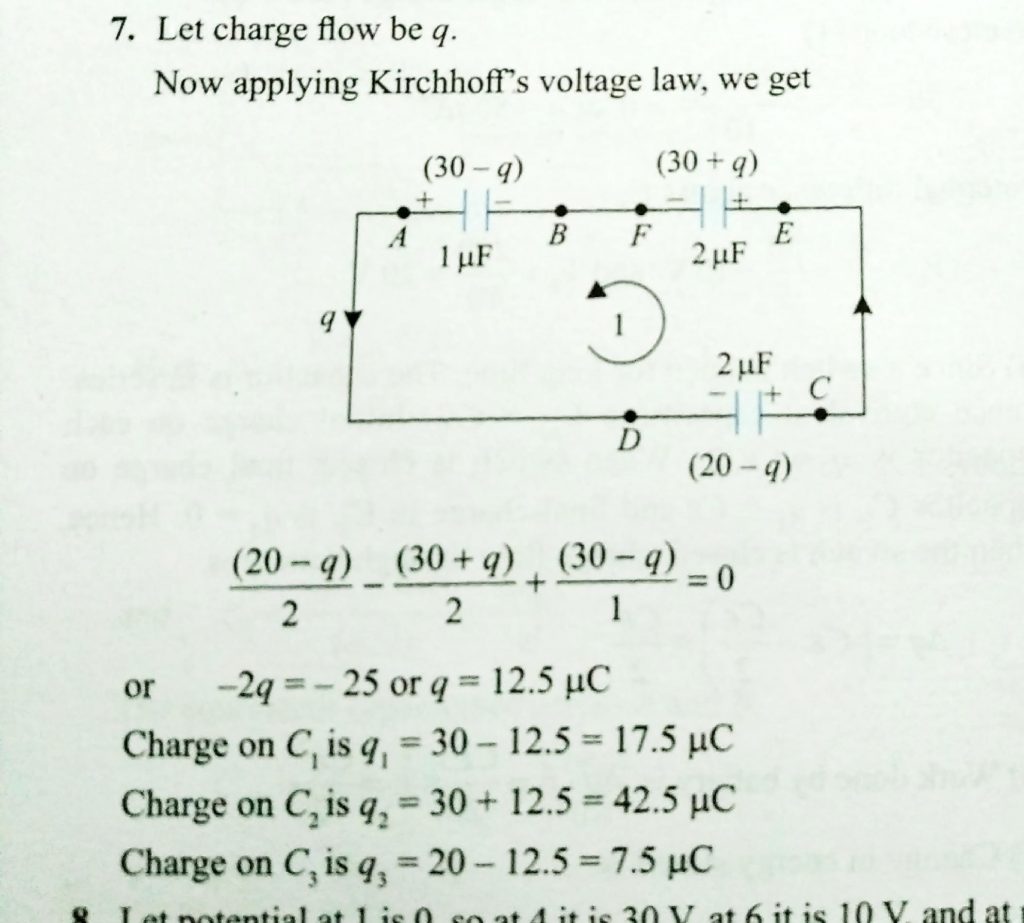 Three capacitors of capacitances 1μF,2μF, and 2μF, are cahrged up to the potential difference 30V,10V, and 15V, respectivly. If terminal A is connected with DC is connected with E and F is connected eith B, the find the charge flow in the ciruit and the final charge on the capacitors.