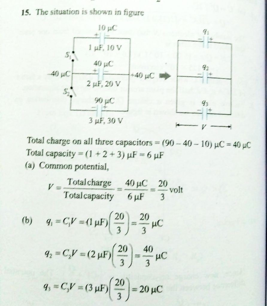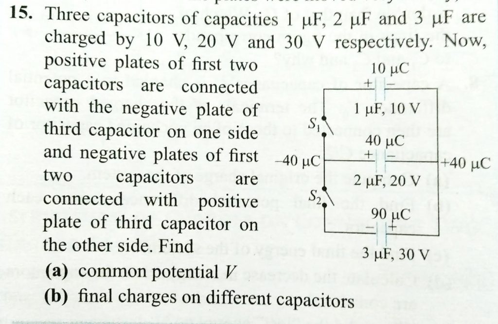 Three capcaitors of capacities 1μF,2μF and 3μF are charged by 10V,20V and 30V respectively. Now positive plates of first two capacitors are connected with the negative plate of third capacitor on one side and negative plates of first wo capacitors are connectes with positive of third capacitor on the other side. Find a. common potential V b. final charges on different capacitors.