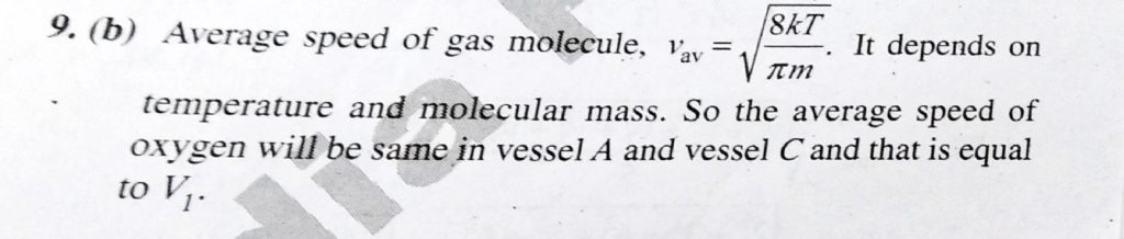 Three closed vessels A,B and C are at the same temperature T and contain gases which obey the Maxwellian distribution of velocities. Vessel A contains only O2,B only N2 and C a mixture of equal quantities of O2 and N2. If the average speed of the O2 molecules in vessel A is V1, that of the N2 molecules in vessel B is V2, the average speed of the O2 molecules in vessel C is (where M is the mass of an oxygen molecules)