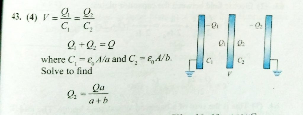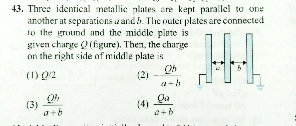 Three identical metallic plates are kept parallel to one another at separations a and b. The outer plates are connected to the ground and the middle plate is given charge Q. Then, the charge on the right side of middle plate is the charge on the right side of middle plate is Three identical metallic plates are kept parallel to one another at separations a and b. The outer plates are connected to the ground and the middle plate is given charge Q. Then November 8, 2020 Category: Uncategorised (JEE Advanced Physics by BM Sharma + GMP Solutions) , Facebook Messenger WhatsApp Share this:TwitterFacebook Related