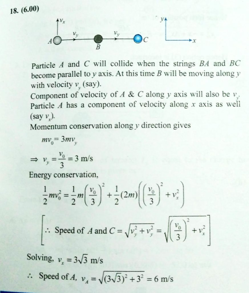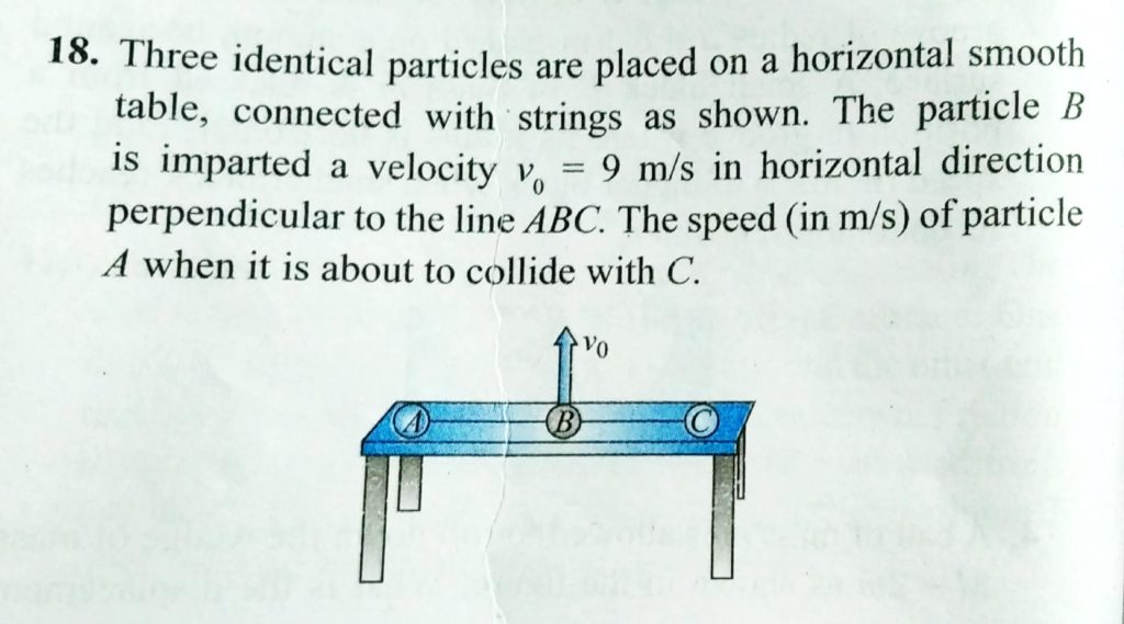 Three identical particles are placed on a horizontal smooth table, connected with strings as shown. The particle B is imparted a velocity V0 = 9 m/s in horizontal direction perpendicular to the line ABC. Find speed of particle A when it is about to collide with C.Three identical particles are placed on a horizontal smooth table, connected with strings as shown. The particle B is imparted a velocity V0 = 9 m/s in horizontal direction perpendicular to the line ABC. Find speed of particle A when it is about to collide with C.
