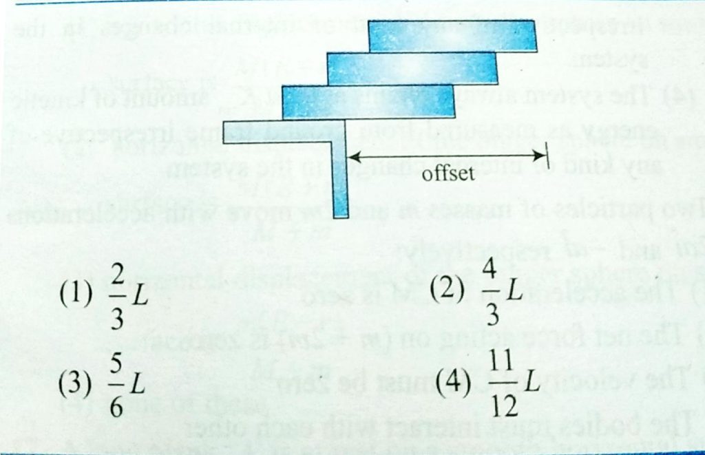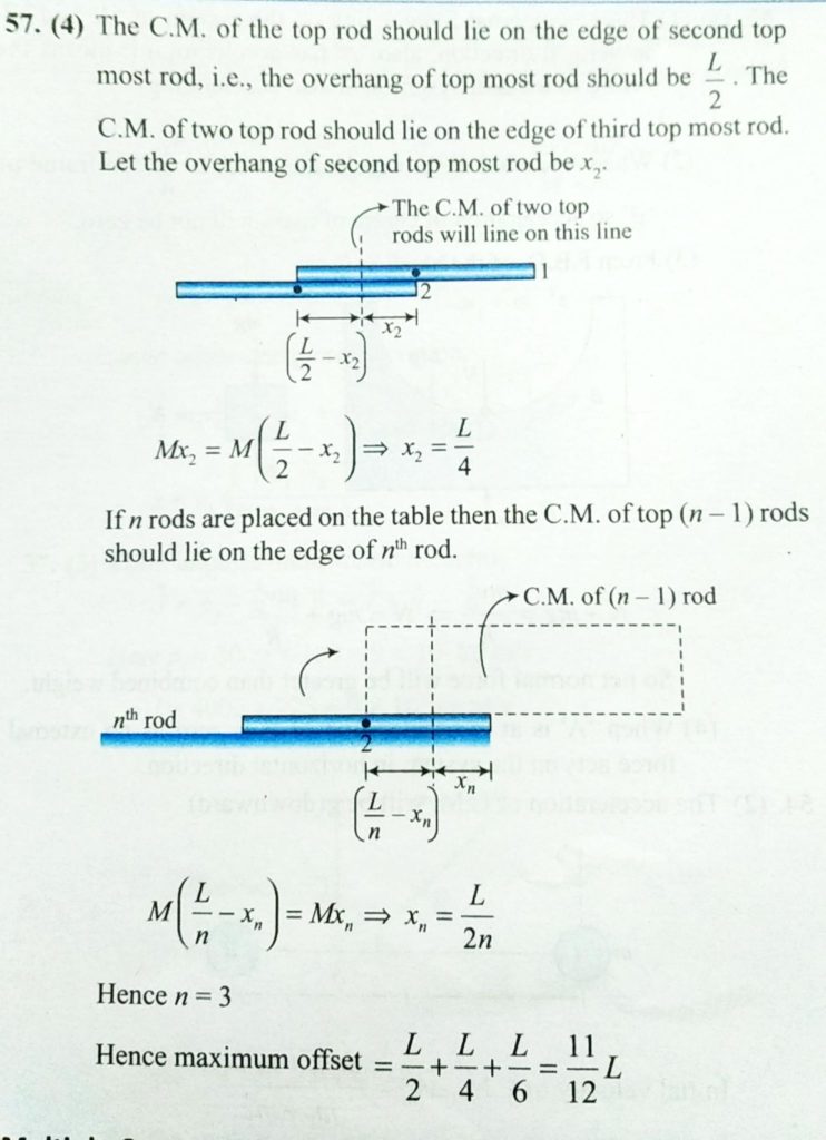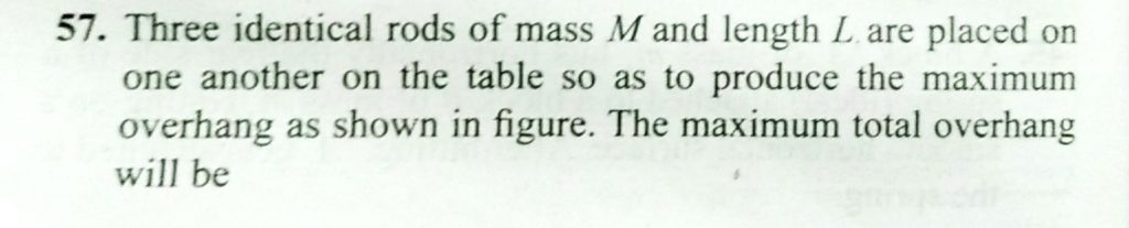 Three identical rods of mass M and length L are placed on one another on the table so as to produce maximum overhang as shown in fig. The maximum total overhang will be Three identical rods of mass M and length L are placed on one another on the table so as to produce maximum overhang as shown in fig. The maximum total overhang will be September 21, 2020 Category: Uncategorised (JEE Advanced Physics by BM Sharma + GMP Solutions) , Facebook Messenger WhatsApp Share this:TwitterFacebook Related