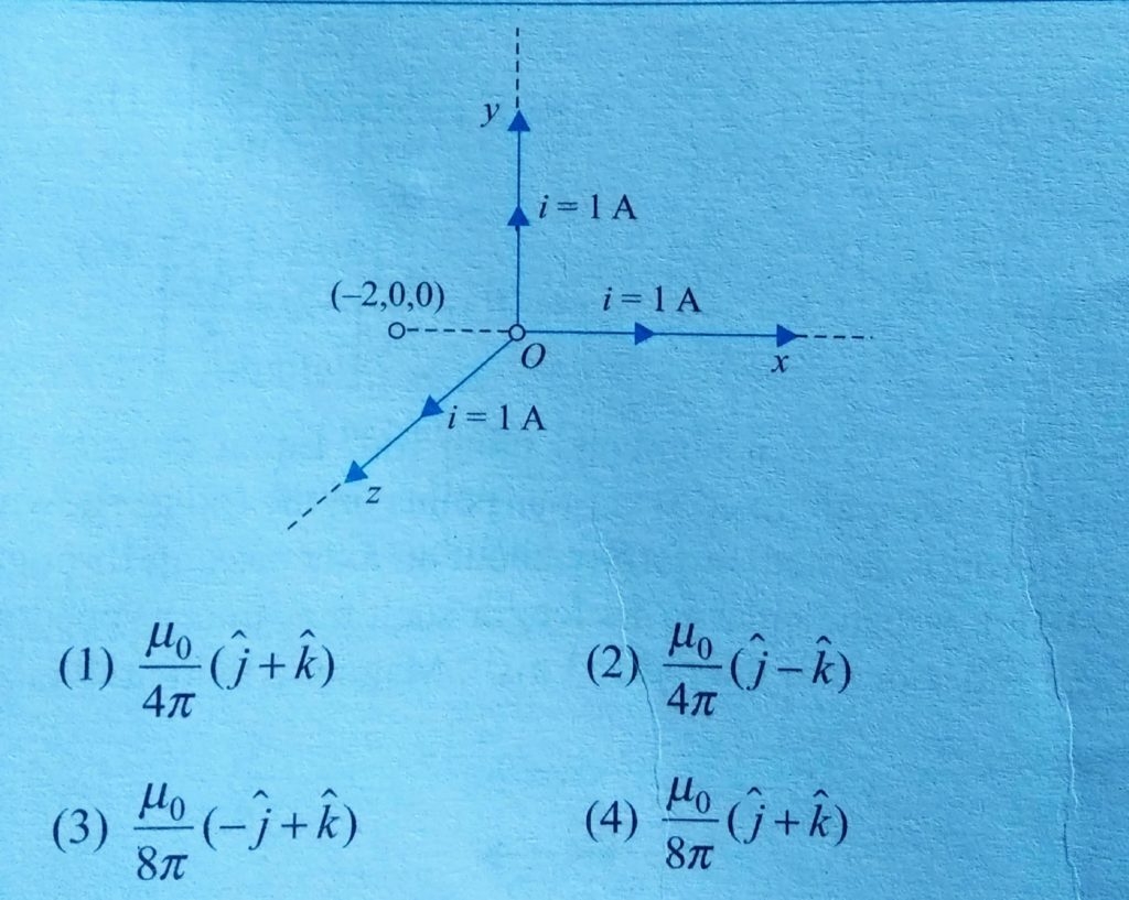 Three infinitely long wires each carrying a current 1 A, are placed such that one end of each wire is at the origin , and , one of these wires is along x axis, and the other y axis and the third along z axis . Magnetic induction at point ( -2 m, 0 , 0 ) due to the system of these wires can be expressed as