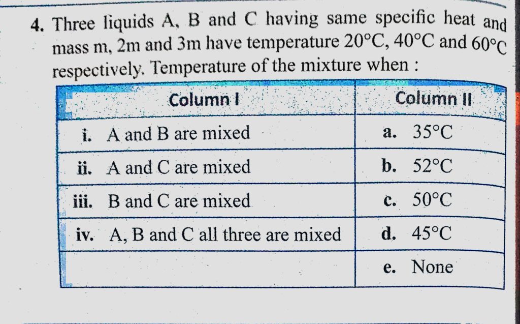 Three liquids A, B and C having same specific heat and mass m, 2m and 3m have temperature 20 C, 40 C and 60 C respectively. Temperature of the mixture when : 2m and 3m have temperature 20 C 40 C and 60 C respectively. Temperature of the mixture when : B and C having same specific heat and mass m Three liquids A October 24, 2020 Category: Uncategorised (JEE Advanced Physics by BM Sharma + GMP Solutions) , Facebook Messenger WhatsApp Share this:TwitterFacebook Related