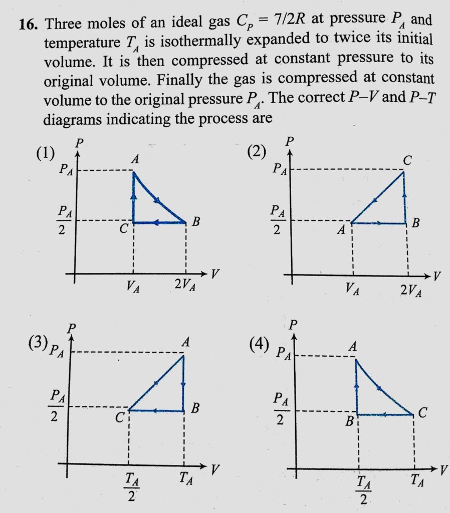 Three moles of an ideal gas Cp = 7/2 R at pressure Pa and temperature TA is isothermally expanded to twice its final volume. It is then compressed at constant pressure to its Three moles of an ideal gas Cp = 7/2 R at pressure Pa and temperature TA is isothermally expanded to twice its final volume. It is then compressed at constant pressure to its October 29, 2020 Category: Uncategorised (JEE Advanced Physics by BM Sharma + GMP Solutions) , Facebook Messenger WhatsApp Share this:TwitterFacebook Related