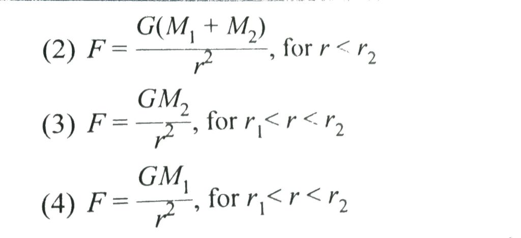 Two concentric shells of masses M 1 and M 2 are having radii r 1 and r 2 . Which if the following is the correct expression for the gravitational field on a mass m? Two concentric shells of masses M 1 and M 2 are having radii r 1 and r 2 . Which if the following is the correct expression for the gravitational field on a mass m? October 3, 2020 Category: Uncategorised (JEE Advanced Physics by BM Sharma + GMP Solutions) , Facebook Messenger WhatsApp Share this:TwitterFacebook Related