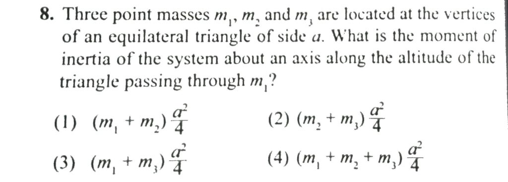 Three point masses M1 M2 and M3 are located at the vertices of an equilateral triangle of length a . the moment of inertia of system about an Axis along the altitude of the triangle passing through M1 is ?? 1 AB = 2l and BC = l. Axes xx and yy pass through the centre of the rectangle. The moment of interia is least about In rectangle ABCD September 25, 2020 Category: Uncategorised (JEE Advanced Physics by BM Sharma + GMP Solutions) , Facebook Messenger WhatsApp Share this:TwitterFacebook Related