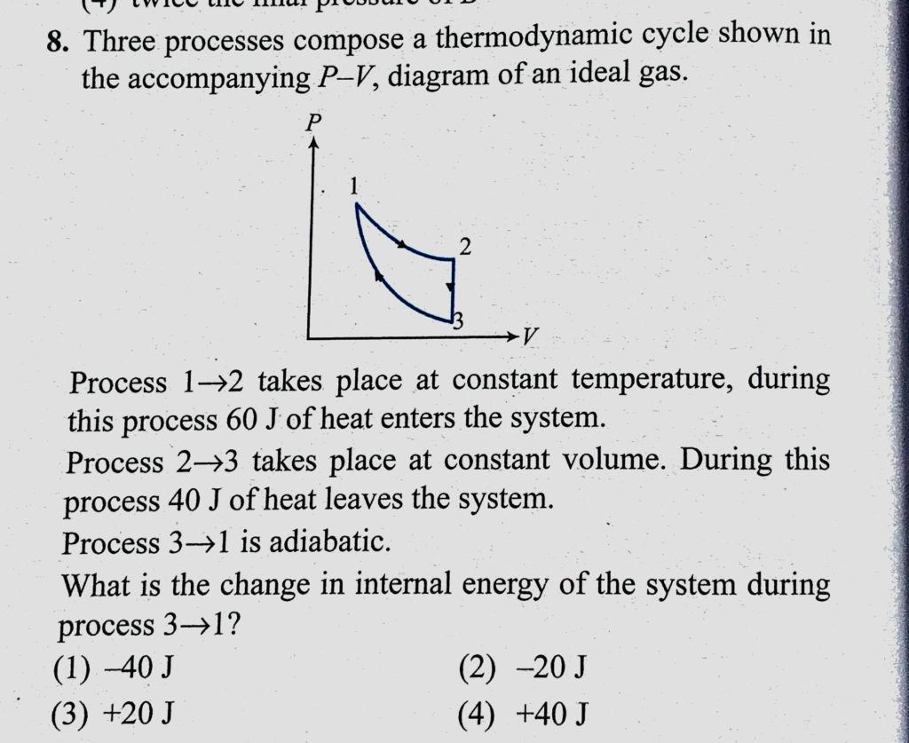 Three processes compose a thermodynamic cycle shown in the accompanying P-V , diagram of an ideal gas. process 1 to 2 takes place at constant temperature, during this process diagram of an ideal gas. process 1 to 2 takes place at constant temperature during this process Three processes compose a thermodynamic cycle shown in the accompanying P-V October 28, 2020 Category: Uncategorised (JEE Advanced Physics by BM Sharma + GMP Solutions) , Facebook Messenger WhatsApp Share this:TwitterFacebook Related