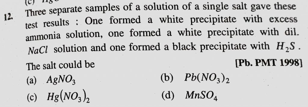 Three seperate samples of a solution of a single salt gave these test results : One formed a white precipitate with excess ammonia solution, one formed a white precipitate with dil. NaCl one formed a white precipitate with dil. NaCl Three seperate samples of a solution of a single salt gave these test results : One formed a white precipitate with excess ammonia solution December 7, 2020 Category: Uncategorised (JEE Advanced Physics by BM Sharma + GMP Solutions) , Facebook Messenger WhatsApp Share this:TwitterFacebook Related