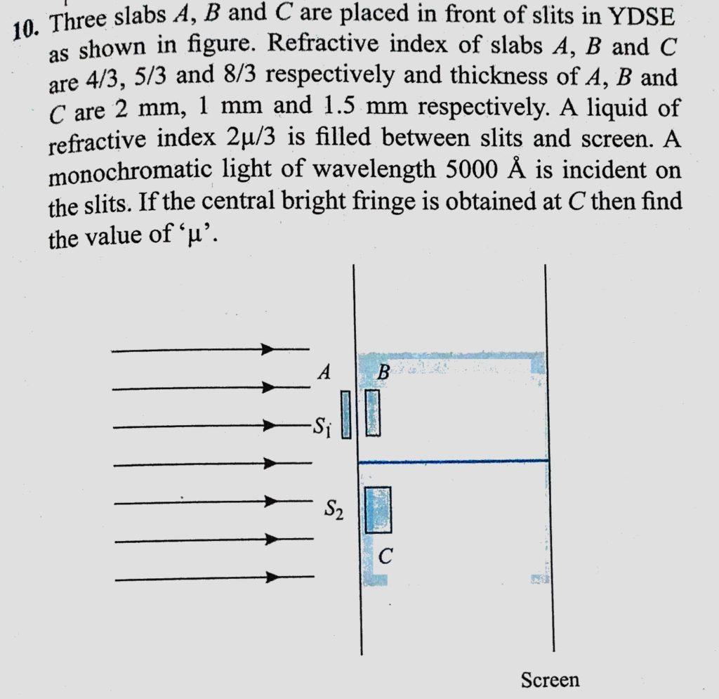 Three slabs A, B and C are placed in front of slits in YDSE as shown in figure. Refractive index of slabs A, B and C are 4/3, 5/3 and 8/3 respectively and thickness of A, B and c are 2mm 5/3 and 8/3 respectively and thickness of A B and c are 2mm B and C are 4/3 B and C are placed in front of slits in YDSE as shown in figure. Refractive index of slabs A Three slabs A October 11, 2020 Category: Uncategorised (JEE Advanced Physics by BM Sharma + GMP Solutions) , Facebook Messenger WhatsApp Share this:TwitterFacebook Related