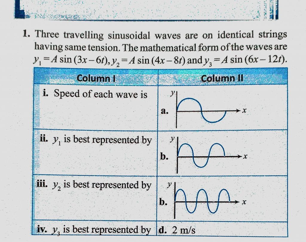 Three travelling sinusoidal waves are on identical strings having same tension. The mathematical form of the waves are y1 = A sin (3x – 6t), y2 = A sin (4x-8t) and y3 = A sin (6x – 12 t). Three travelling sinusoidal waves are on identical strings having same tension. The mathematical form of the waves are y1 = A sin (3x - 6t) y2 = A sin (4x-8t) and y3 = A sin (6x - 12 t). November 5, 2020 Category: Uncategorised (JEE Advanced Physics by BM Sharma + GMP Solutions) , Facebook Messenger WhatsApp Share this:TwitterFacebook Related