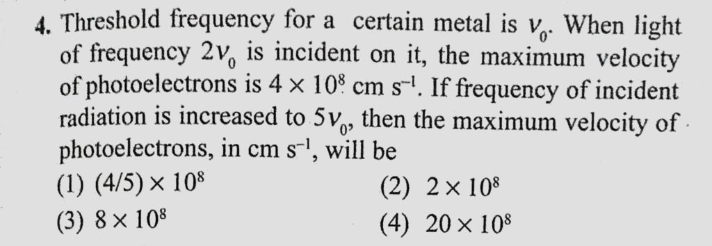 Threshold frequency for a certain metal is v0. When light of frequency 2 V0 is incident on it, the maximum velocity of photoelectrons is 4 * 10^8 cm/s. If frequency of incident radiation the maximum velocity of photoelectrons is 4 * 10^8 cm/s. If frequency of incident radiation Threshold frequency for a certain metal is v0. When light of frequency 2 V0 is incident on it October 12, 2020 Category: Uncategorised (JEE Advanced Physics by BM Sharma + GMP Solutions) , Facebook Messenger WhatsApp Share this:TwitterFacebook Related