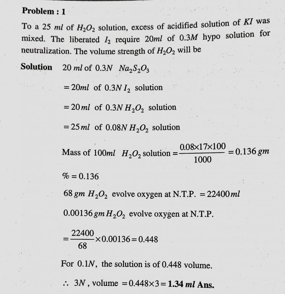 To a 25 ml of H2O2 solution, excess of acidified solution of KI was mixed. The liberated I2 require 20 ml of 0.3 M hypo solution for neutralization. The volume strength of H2O2 will be excess of acidified solution of KI was mixed. The liberated I2 require 20 ml of 0.3 M hypo solution for neutralization. The volume strength of H2O2 will be To a 25 ml of H2O2 solution December 8, 2020 Category: Uncategorised (JEE Advanced Physics by BM Sharma + GMP Solutions) , Facebook Messenger WhatsApp Share this:TwitterFacebook Related