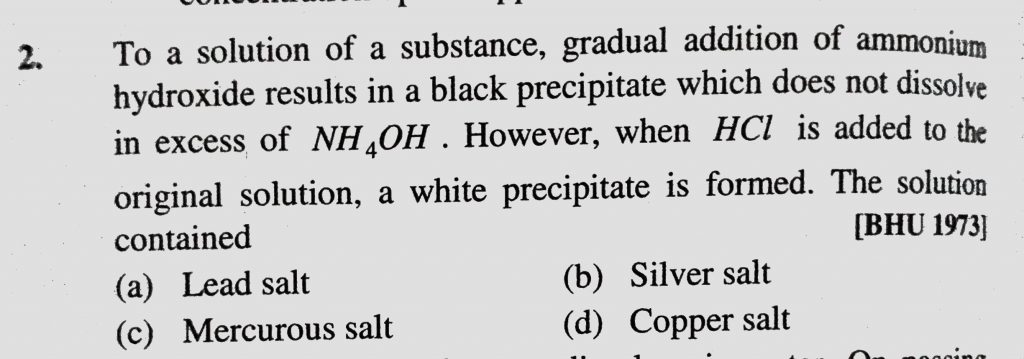 To a solution of a substance, gradual addition of ammonium hydroxide results in a black precipitate which does not dissolve in excess of NH4OH. However, when HCl is added to the original gradual addition of ammonium hydroxide results in a black precipitate which does not dissolve in excess of NH4OH. However To a solution of a substance when HCl is added to the original December 7, 2020 Category: Uncategorised (JEE Advanced Physics by BM Sharma + GMP Solutions) , Facebook Messenger WhatsApp Share this:TwitterFacebook Related