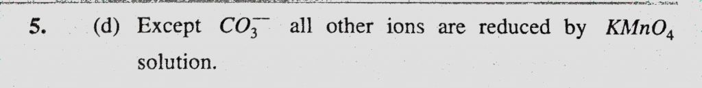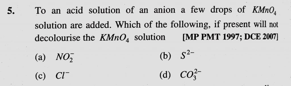 To an acid solution of an anion a few drops of KMnO4 solution are added. Which of the following , if present will not decolourise the KMnO4 solution if present will not decolourise the KMnO4 solution To an acid solution of an anion a few drops of KMnO4 solution are added. Which of the following December 7, 2020 Category: Uncategorised (JEE Advanced Physics by BM Sharma + GMP Solutions) , Facebook Messenger WhatsApp Share this:TwitterFacebook Related