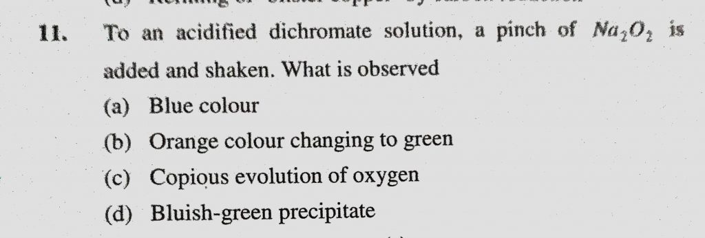 To an acidified dichromate solution, a pinch of Na2O2 is added and shaken. What is observed (a) Blue colour a pinch of Na2O2 is added and shaken. What is observed (a) Blue colour To an acidified dichromate solution December 3, 2020 Category: Uncategorised (JEE Advanced Physics by BM Sharma + GMP Solutions) , Facebook Messenger WhatsApp Share this:TwitterFacebook Related