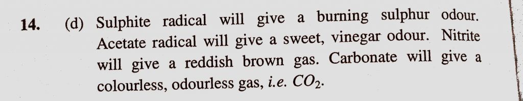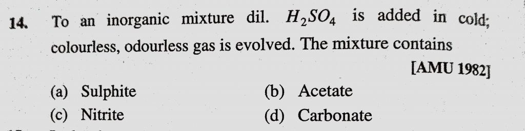 To an inorganic mixture dil. H2SO4 is added in cold; colourless, odourless gas is evolved. The mixture contains (a) Sulphite (b) Acetate (c) Nitrite (d) Carbonate odourless gas is evolved. The mixture contains (a) Sulphite (b) Acetate (c) Nitrite (d) Carbonate To an inorganic mixture dil. H2SO4 is added in cold; colourless December 6, 2020 Category: Uncategorised (JEE Advanced Physics by BM Sharma + GMP Solutions) , Facebook Messenger WhatsApp Share this:TwitterFacebook Related