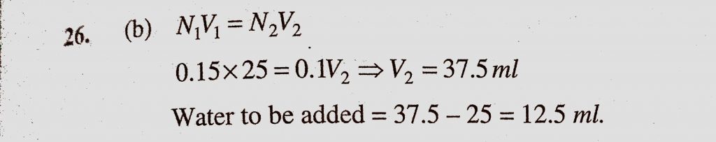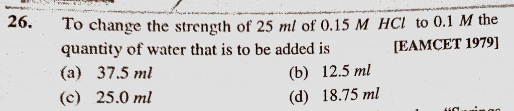 To change the strength of 25 ml of 0.15 M HCl to 0.1 M the quantity of water that is to be added is To change the strength of 25 ml of 0.15 M HCl to 0.1 M the quantity of water that is to be added is December 7, 2020 Category: Uncategorised (JEE Advanced Physics by BM Sharma + GMP Solutions) , Facebook Messenger WhatsApp Share this:TwitterFacebook Related