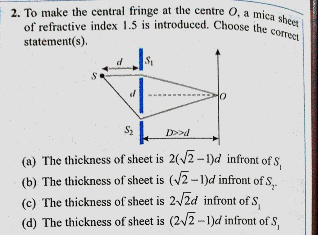 To make the central fringe at the centre O, a mica sheet of refractive index 1.5 is introduced. Choose the correct statement(s). a mica sheet of refractive index 1.5 is introduced. Choose the correct statement(s). To make the central fringe at the centre O October 10, 2020 Category: Uncategorised (JEE Advanced Physics by BM Sharma + GMP Solutions) , Facebook Messenger WhatsApp Share this:TwitterFacebook Related