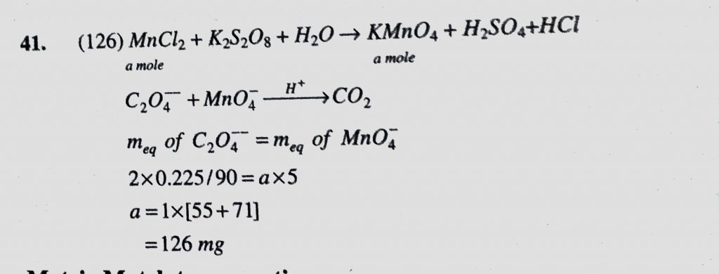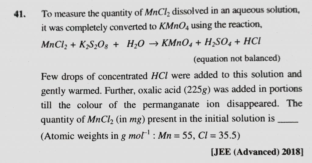 To measure the quantity of MnCl2 dissolved in an aqueous solution, it was completely converted to KMnO4 using the reaction. MnCl2 + K2S2O8 + H2O to KMnO4 + H2SO4 + HCl Few drops of concentrated HCl were added it was completely converted to KMnO4 using the reaction. MnCl2 + K2S2O8 + H2O to KMnO4 + H2SO4 + HCl Few drops of concentrated HCl were added To measure the quantity of MnCl2 dissolved in an aqueous solution December 3, 2020 Category: Uncategorised (JEE Advanced Physics by BM Sharma + GMP Solutions) , Facebook Messenger WhatsApp Share this:TwitterFacebook Related