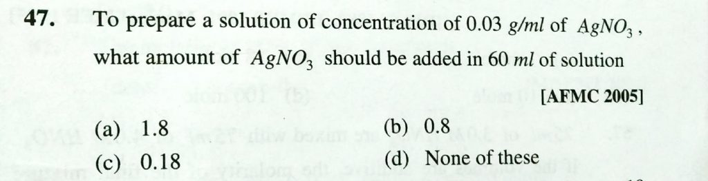 To prepare a solution of concentration of 0.3 g/ml of AgNO3 should be added in 60 ml of solution To prepare a solution of concentration of 0.3 g/ml of AgNO3 should be added in 60 ml of solution December 11, 2020 Category: Uncategorised (JEE Advanced Physics by BM Sharma + GMP Solutions) , Facebook Messenger WhatsApp Share this:TwitterFacebook Related